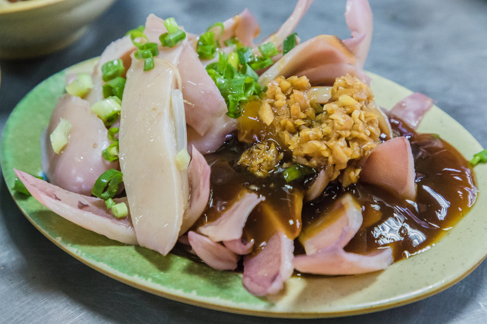 ▲燙魷魚(80元)。搭配蔥、蒜頭酥跟醬油膏,非常古早味的口味!