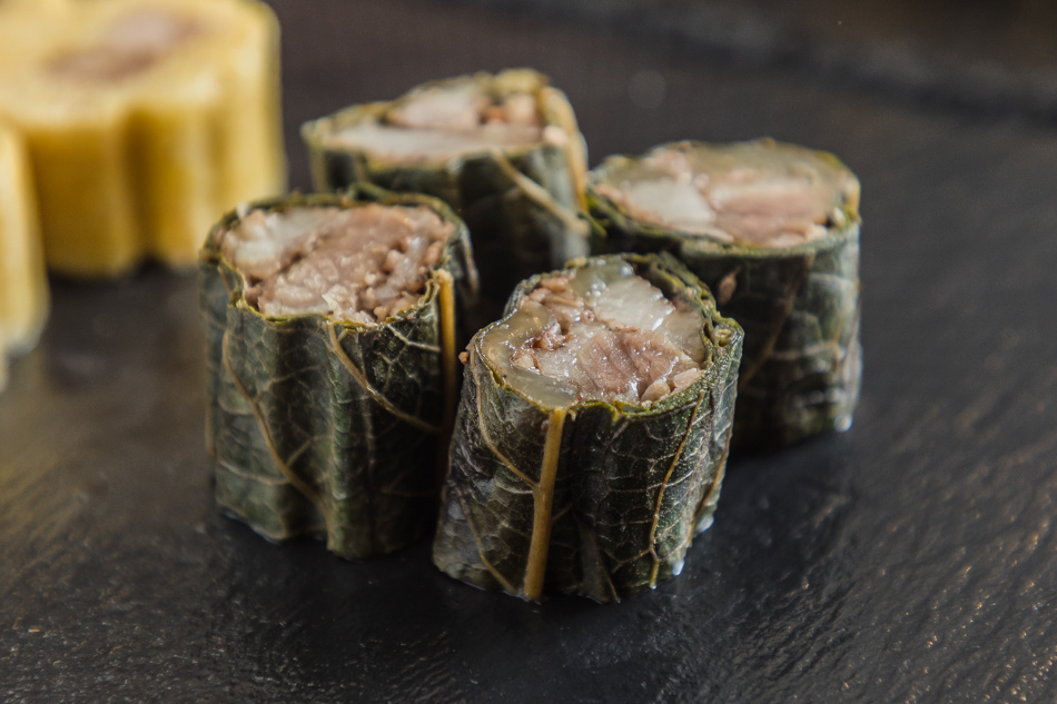 ▲前菜2 - 吉拿富。裡面是小米、芋頭粉跟豬肉的組合,外面用假酸漿葉包起來。假酸漿葉包的吉拿富吃了比較不會脹氣,而且還有特殊香氣,可以讓人一次吃好幾個,但因為今天菜色豐富,所以吃一個嚐嚐味道。