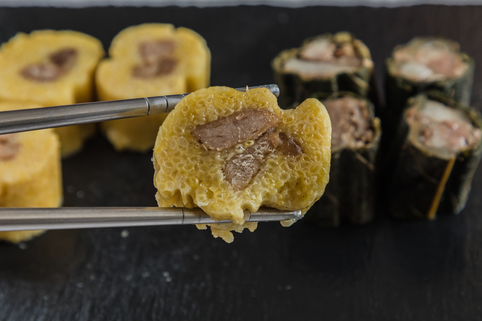 ▲吉拿富意思是做成捲狀的食物,是用小米做成的,裡面有包入豬肉,還會散發著淡淡的月桃葉香氣,不用沾漿就很夠味。