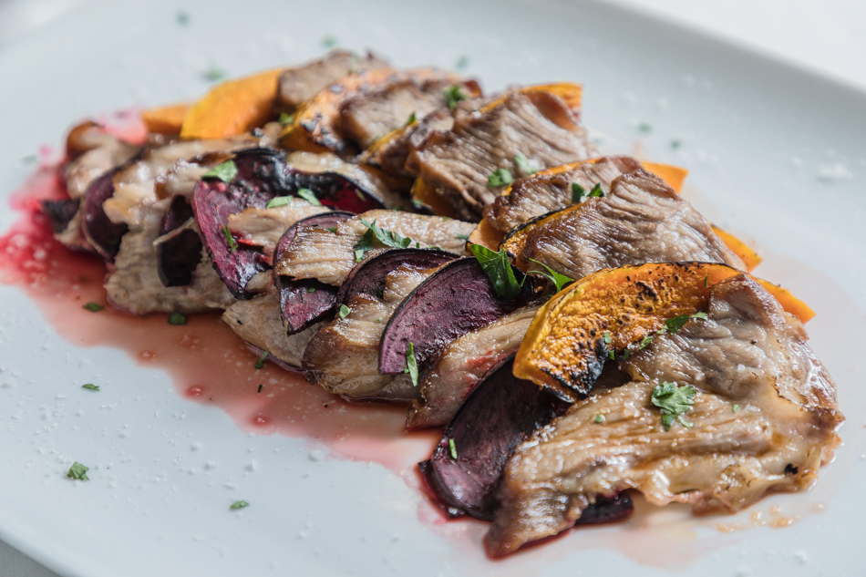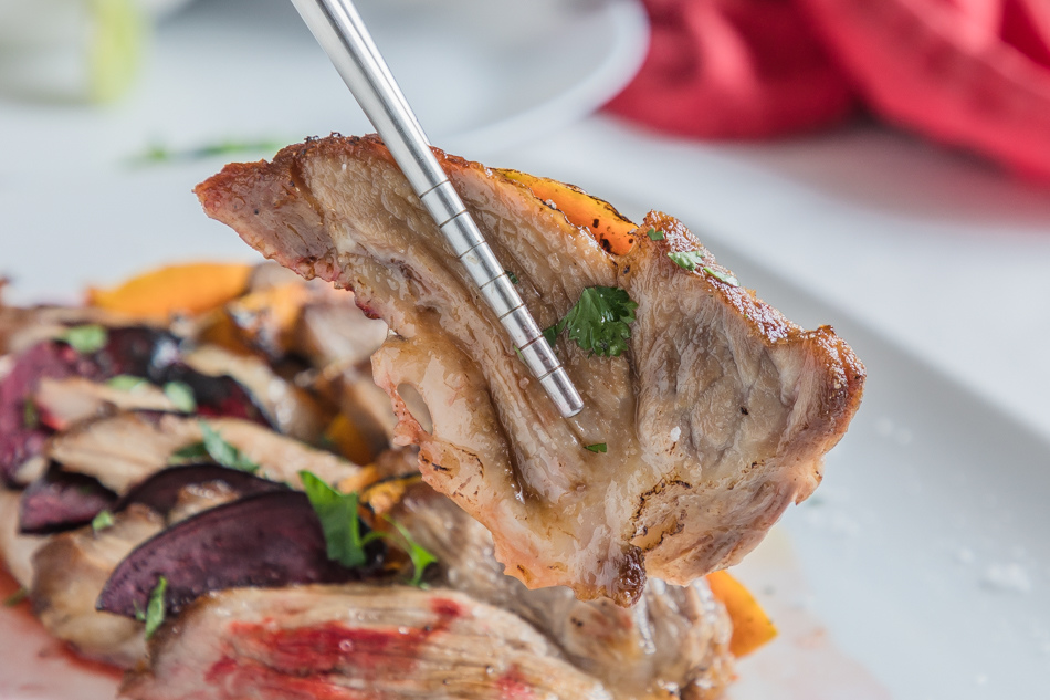 ▲豬肉很JUICY,搭配甜菜根跟南瓜一起享用,豬肉切成這樣子的口感有很棒,有薄跟厚的部份,增加嚼勁,還有一點海鹽增鮮提味,而且是那種一顆顆的海鹽,很粗獷的感覺唷。