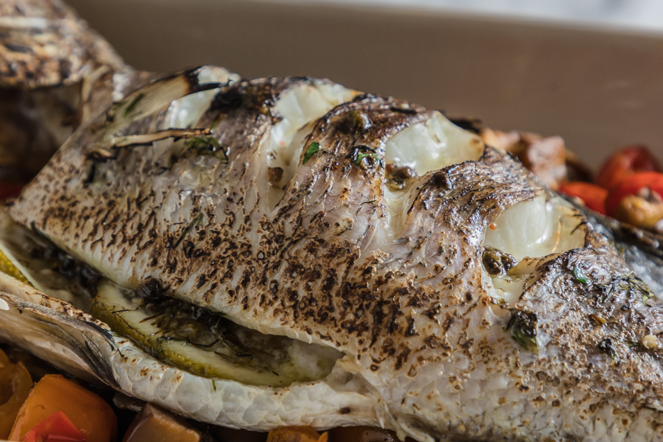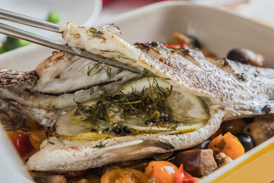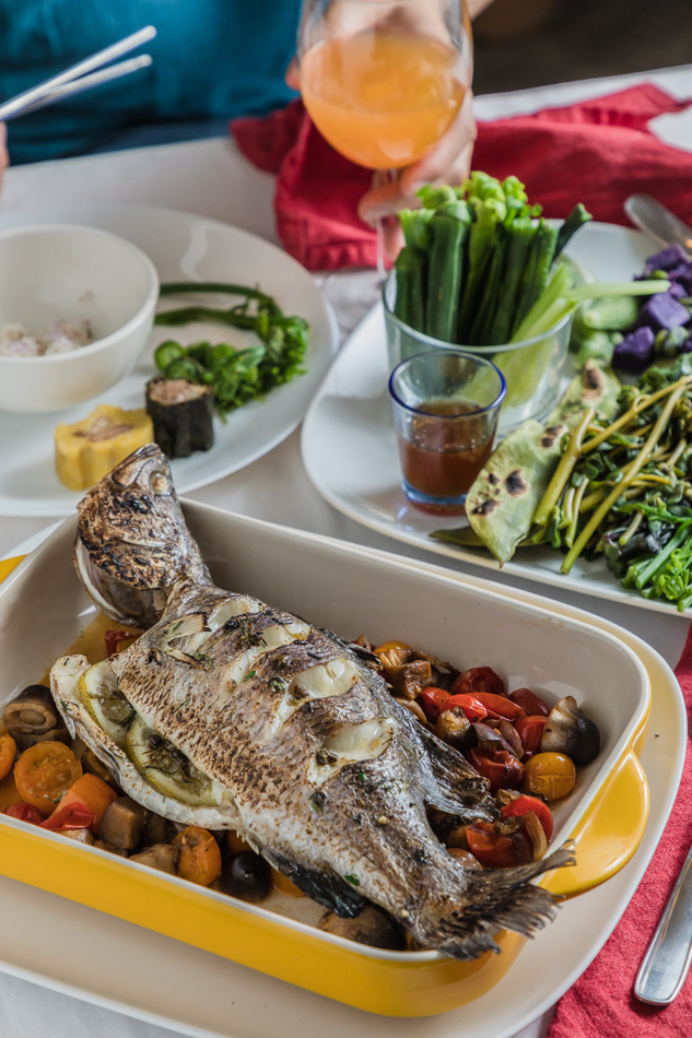 ▲馬告烤魚。烤的啵兒香的鱸魚,裡面還有蕃茄跟菇菇,我最喜歡烤過後的蕃茄,甜味跟香氣也是一極棒。